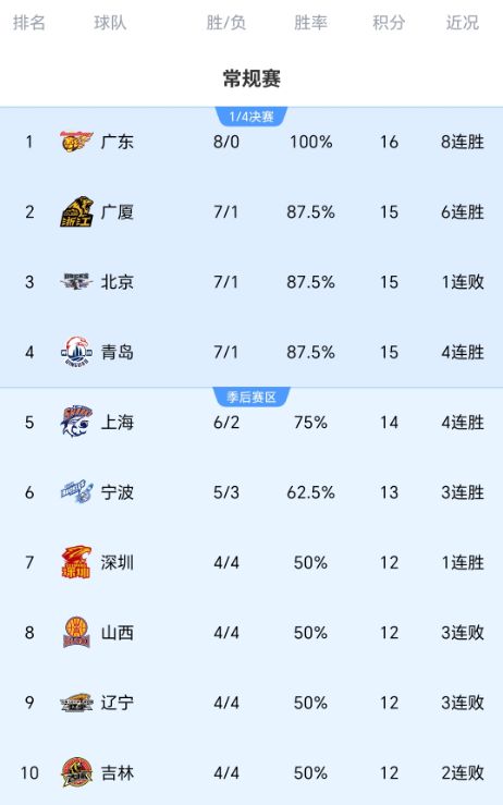 随着广东8轮全胜,广厦送北京首败,CBA最新积分榜有变:榜首易主