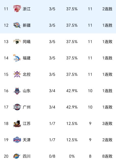 CBA积分榜:广东8连胜登顶,广厦反超北京升第二,四川队破罐破摔