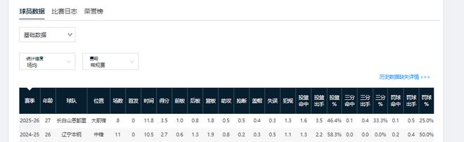 数据方面,刘雁宇离开辽篮前的最后一个赛季,常规赛场均可登场10.5分钟,能得2.7分1.9篮板。本赛季代表吉林队打了8场后,场均登场11.8分钟,可得3.5分1.8篮板。通过数据看,他也没太大进步。不是泼冷水,以刘雁宇目前的条件和能力,他的职业发展恐怕很难达到预期。