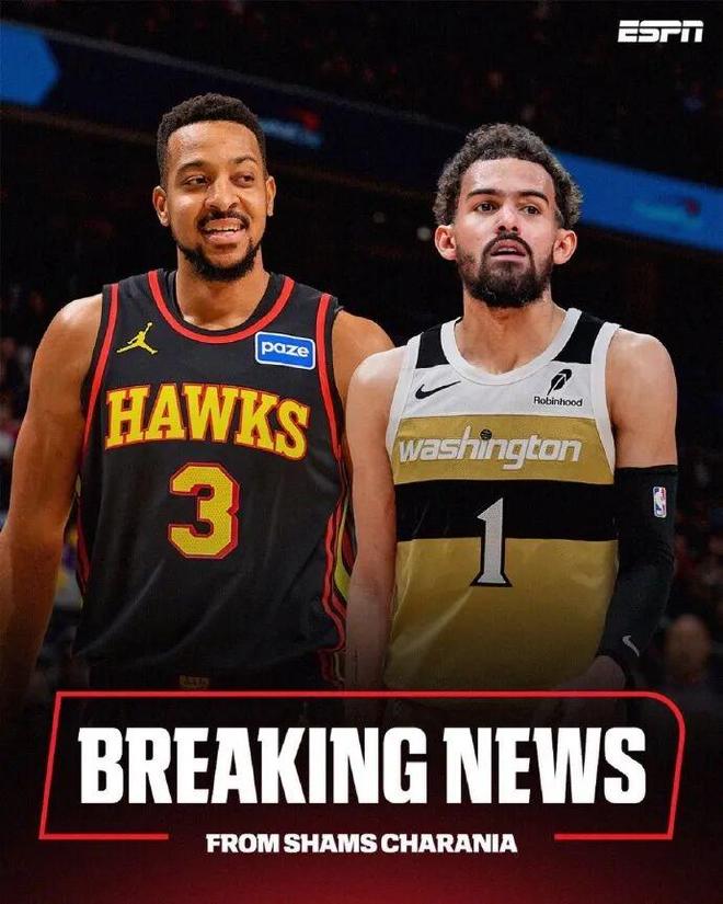 Shams报道:老鹰队将四届全明星特雷·杨交易至奇才,换来CJ·麦科勒姆和科里·基斯珀特。