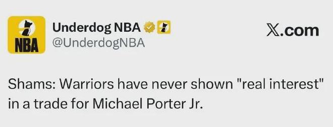 之前勇士跟篮网的小波特“绯闻”满天飞,更是有人说后者已经买好了前往金州的飞机票。然而爆料王Shams对此有不同的看法,表示勇士从未对小波特表现出真正的兴趣,更是已有一个多月没与篮网进行实质性对话。