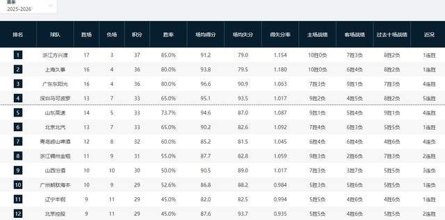 CBA积分榜最新排名!广厦杀回第一,上海广东抢第2,新疆遭滑铁卢