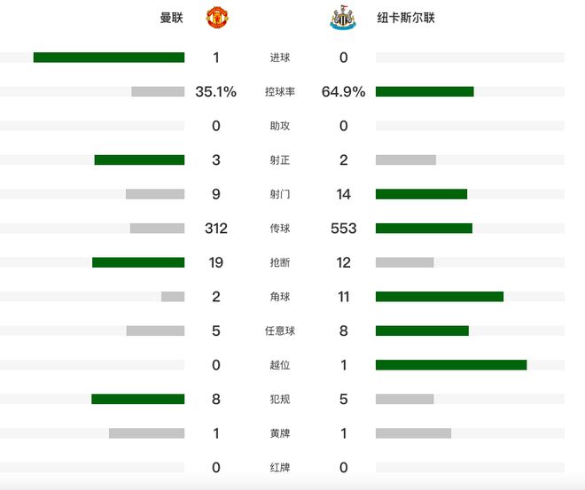 与纽卡一役控球率仅33.4%,为曼联本赛季英超单场最低