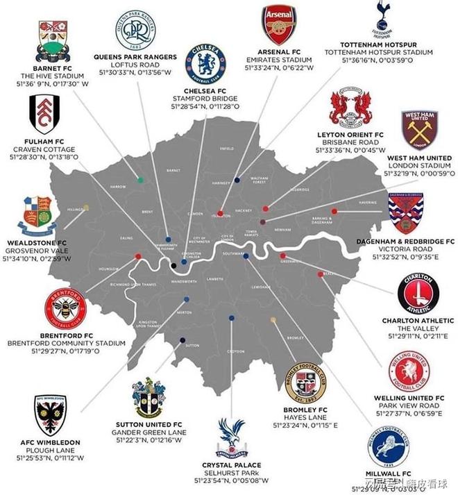 先看看一张图,来自伦敦,或者大伦敦的球队有很多,每年的顶级联赛,都有很多场伦敦德比。本赛季的英超,阿森纳、切尔西、水晶宫、布伦特福德、富勒姆、热刺和西汉姆等球队,都是伦敦圈子的一员。
