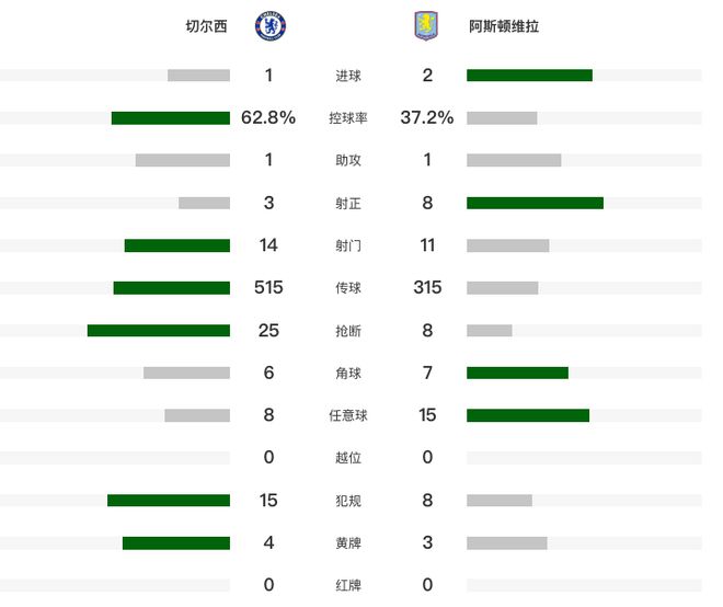 第63分钟,罗杰斯直塞助攻,沃特金斯单刀破门扳平比分,维拉1-1切尔西。