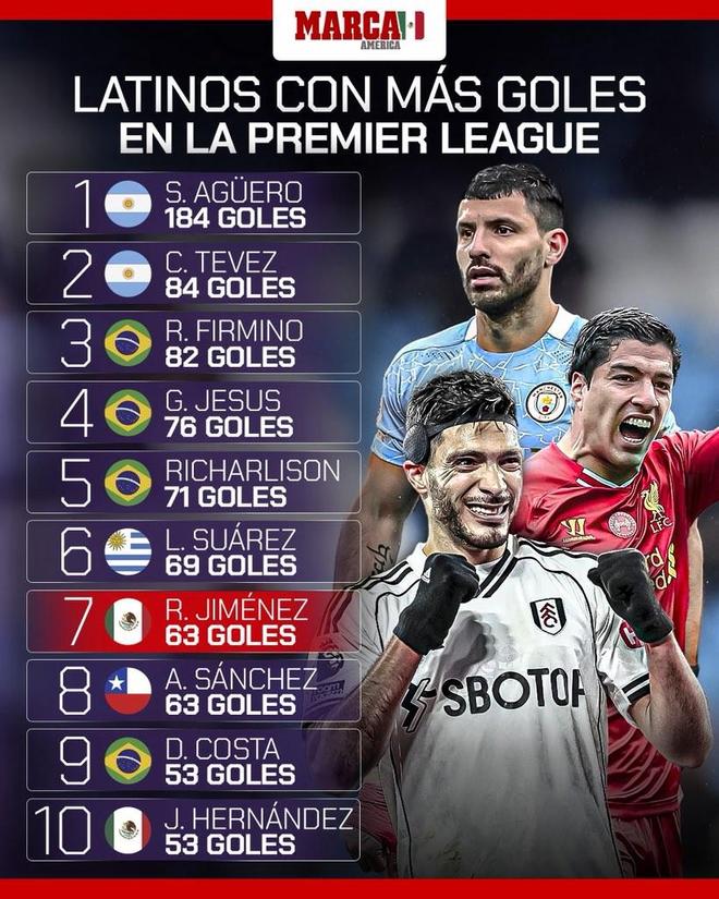 根据统计,现年34岁的劳尔-希门尼斯生涯至今已经在英超联赛中打进了63球,他也就此追平了阿森纳和曼联旧将桑切斯,并列成为英超历史进球数第7多的拉美球员。