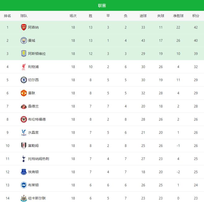 争四集团的竞争同样激烈。利物浦近期状态回暖,一波联赛三连胜让他们悄然攀升至第4位。切尔西和曼联同积29分,分列第5和第6,距离欧冠区始终只有一步之遥。桑德兰紧随其后,28分排名第7,依然是最具冲击力的搅局者。整体来看,英超第18轮过后,无论是争冠还是争四,形势都愈发胶着。强队不再稳如泰山,黑马也开始承受持续作战带来的压力。
