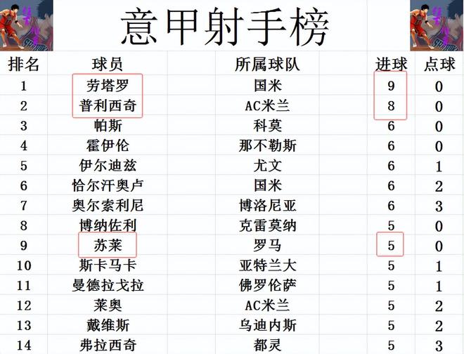 射手榜方面,劳塔罗9球领跑,普利西奇1球之差紧随其后,帕斯,霍伊伦,伊尔迪兹,恰尔汗奥卢和奥尔索里尼6球并列第3。苏莱今天打入一球后,追上斯卡马卡,莱奥等人5球刚好挤入前十。