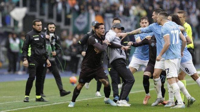 其中马佐基和马鲁西奇扭打在一起,56岁那不勒斯主帅孔蒂不得不冲进场内,奋力拉开两人。最终,马佐基和马鲁西奇双双被红牌罚下场。双方此役共计吃到3红6黄,其中拉齐奥2红5黄。