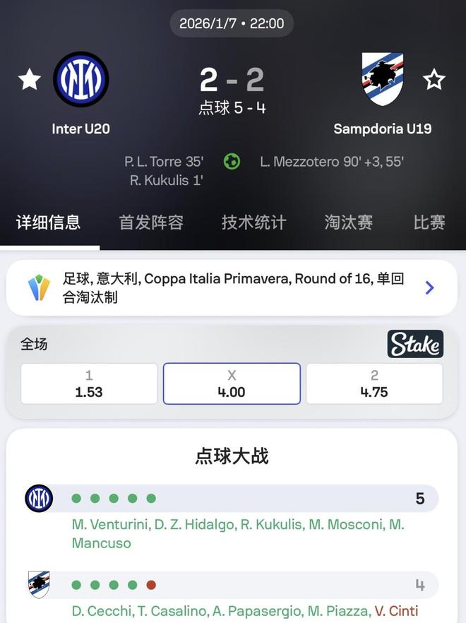 早些时间率先开始的意青杯赛八分之一决赛,国际米兰U19在半场两球领先的情况下,被身处意青联乙级联赛的桑普多利亚U19连追两球,伤停补时阶段打入绝平进球;好在,接下来的点球大战当中,蓝黑小将们毫无思想包袱,5罚5中,最终点球5比4淘汰对手,进入意青杯八强。