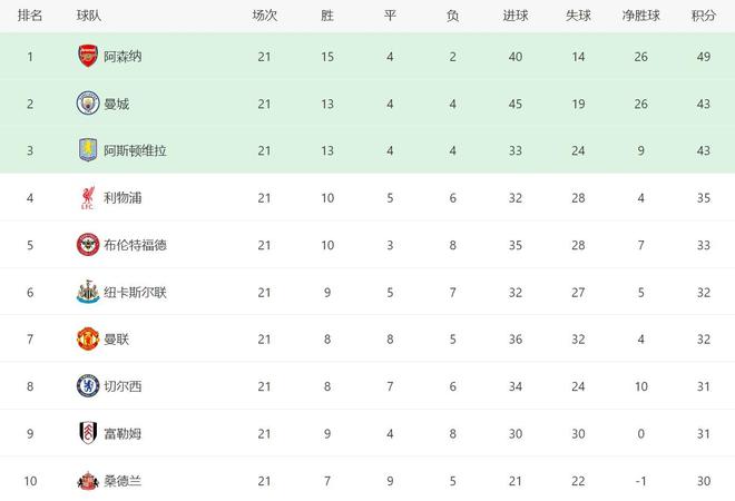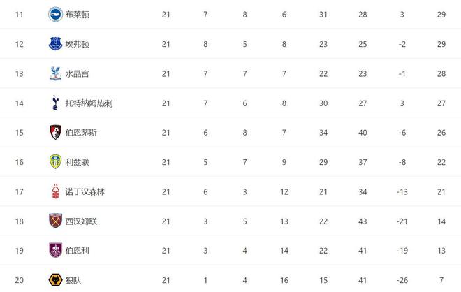 昨日凌晨结束的几场比赛,曼城1-1打平布莱顿、维拉0-0打平水晶宫、切尔西1-2输给富勒姆、2-2打平伯恩利、热刺2-3不敌伯恩茅斯、布伦特福德3-0大胜桑德兰、纽卡斯尔4-3险胜利兹联、狼队1-1打平埃弗顿。