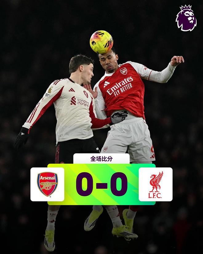 最终全场比赛结束,两队0-0握手言和,阿森纳连胜脚步终止,利物浦收获3连平。在联赛积分榜上,阿森纳的领先优势扩大到了6分。