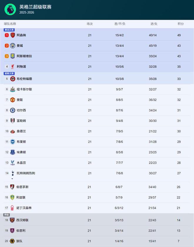 本赛季阿森纳表现稳定,已经长时间领跑英超积分榜,与阿森纳争冠的曼城、切尔西、阿斯顿维拉等队不断爆冷丢分,给阿森纳留下了最佳争冠良机。
