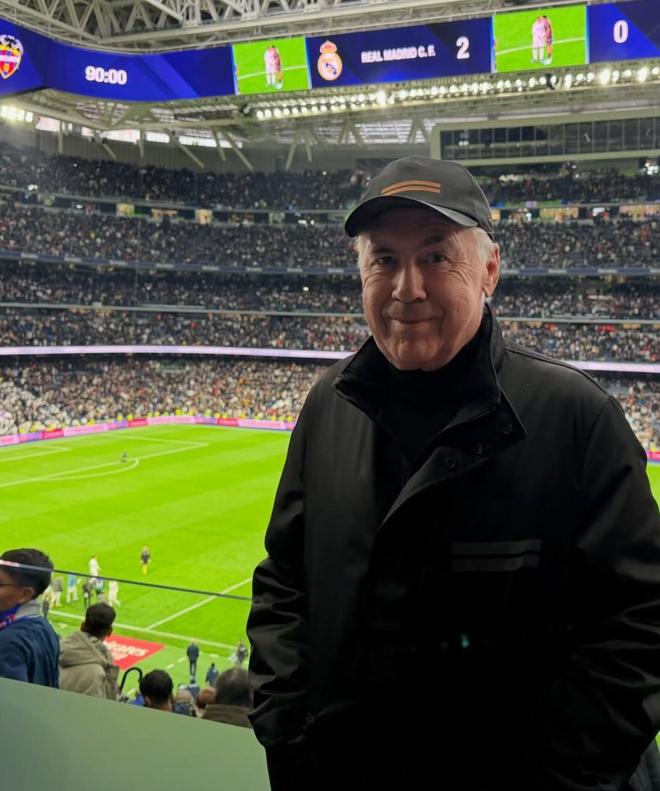 安切洛蒂回伯纳乌看球并社媒发文:看到皇马取胜真的很开心