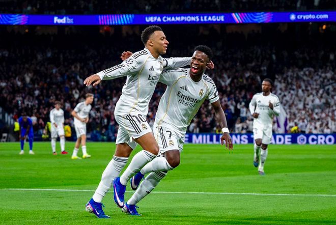 第27分钟,皇马打出快速反击,维尼修斯高速插上后的传中相当舒服,姆巴佩轻松梅开二度,进球后,皇马两大巨星相拥庆祝。