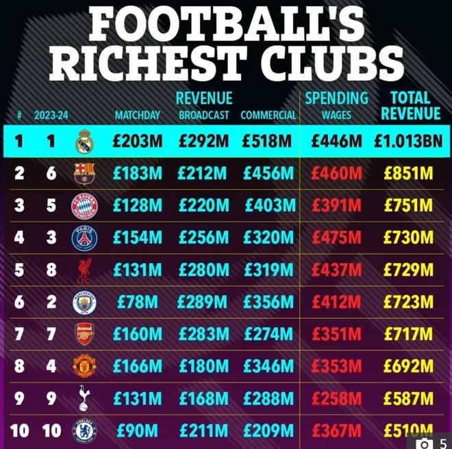 利物浦的营收达到约7.3亿英镑,从2023-24赛季的第八位(现在曼联的位置)跃升至第五位。