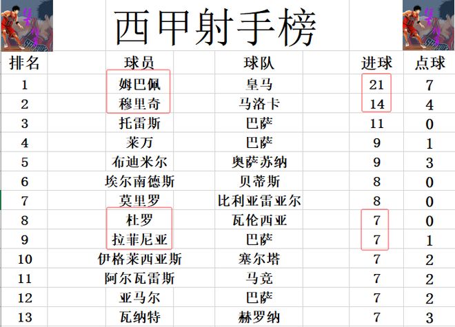 射手榜方面,姆巴佩梅开二度后,成为赛季第1个进球上20的球员,领先第2名的穆里奇7球稳居榜首。托雷斯11球第3,布迪米尔追上莱万,两人9球并列第4。杜罗追上拉菲尼亚,亚马尔等人7球刚好挤入前十。