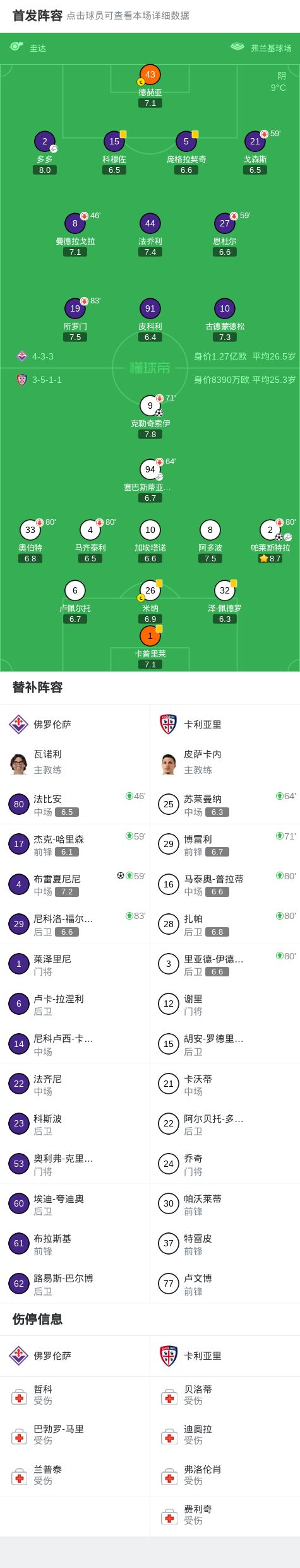 佛罗伦萨1-2卡利亚里,帕莱斯特拉传射建功,布雷夏尼尼破门